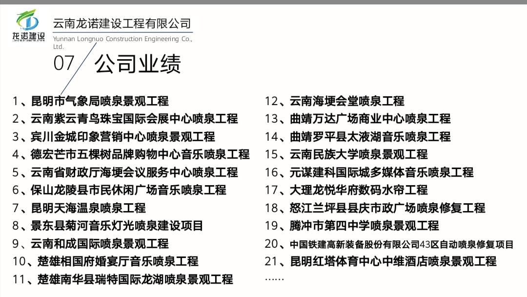 云南龍諾噴泉公司工程業(yè)績(jī)表