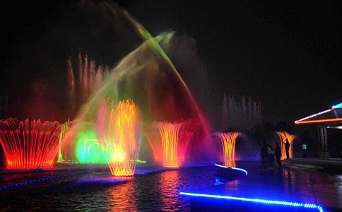 噴泉,使靜水變?yōu)閯?dòng)水,使水也有了靈魂,又輔之以各種燈光效果,使水體具有豐富多彩的形態(tài),可以緩沖、軟化城市中“凝固的建筑物”和硬質(zhì)的地面